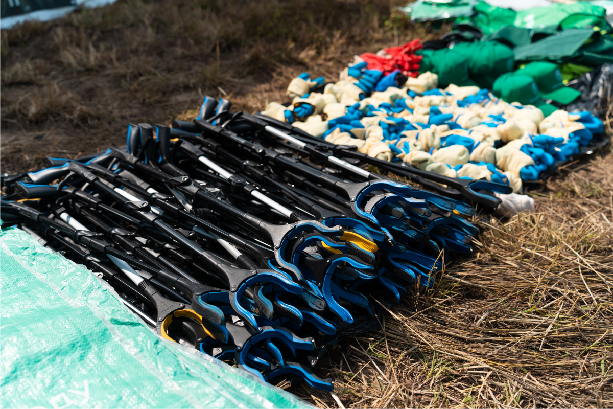 Во время очищения природных территорий часто встречаются такие неприятные находки, как битое стекло, шприцы, гигиенические салфетки и прочие предметы личного пользования, брать которые голыми руками крайне нежелательно. К тому же мусор нередко оказывается в труднодоступных зонах — под камнями, среди колючих кустарников, в водоемах или на крутых склонах. Чтобы позаботиться о наших волонтёрах, мы выдаём им экощипцы, которые превращают субботник в увлекательное действо.