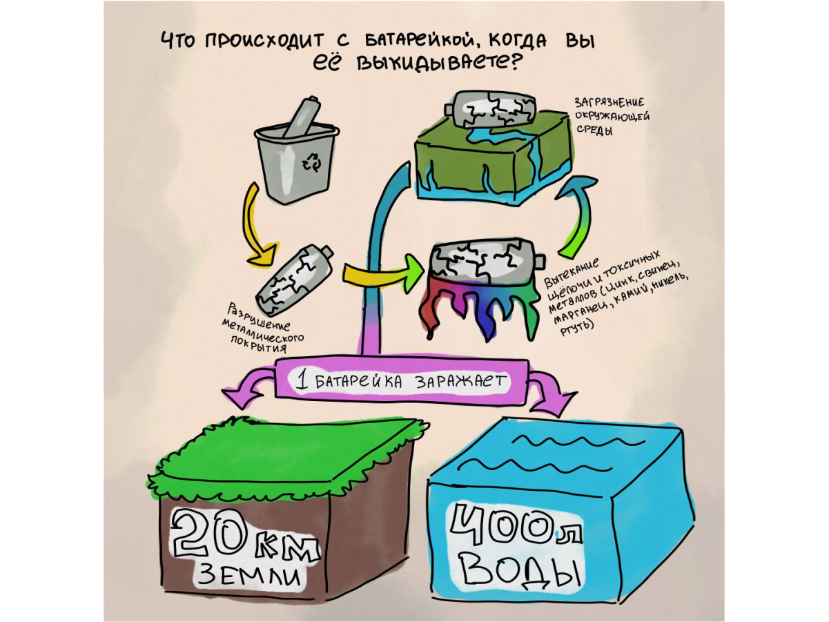 Со временем корпус батарейки разрушается, и наружу могут выйти содержащиеся в ней тяжелые металлы, щелочь. Поступая в почву, грунтовые воды, они затем попадают в водоемы и организм человека. Один из самых неприятных компонентов батарейки старого образца (в основном выпускались до 2001 года) — ртуть. Годами накапливаясь в тканях, она нередко становится причиной заболеваний нервной системы, дыхания, суставов, печени, почек.