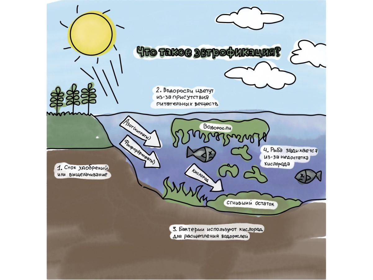 Другой невидимый “вредитель”— фосфаты. Оказываясь в водоемах, они действуют как удобрение и стимулируют разрастание водорослей. Это разрушает биобаланс, лишая привычных условий обитания рыб и других жителей водной системы. Такой процесс называется эвтрофикацией водных объектов.